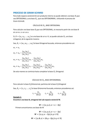 El proceso de Gram-Schmidt permite obtener una base ortogonal y una base ortonormal a partir de cualquier base en un espacio vectorial con producto interno. Se comienza con una base inicial y se aplica el proceso de Gram-Schmidt de forma iterativa para generar vectores ortogonales. Primero se calcula una base ortogonal y luego, partiendo de esta, una base ortonormal dividiendo cada vector por su norma. Se proveen ejemplos de aplicación del método.