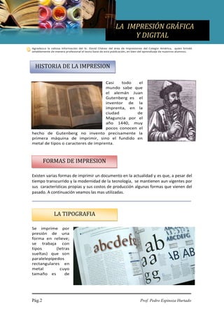 El documento ofrece una visión detallada de la historia y técnicas de impresión gráfica y digital, comenzando con la invención de la imprenta por Gutenberg hasta los métodos modernos como la impresión digital y offset. Se describen diversas técnicas, incluyendo tipografía, serigrafía y procesos de pre-prensa y post-prensa, enfatizando la importancia de cada etapa en la producción de materiales impresos. Además, se destaca la evolución de la tecnología de impresión y su impacto en la producción y costos.