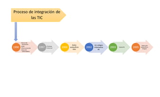 El documento describe la evolución de la integración de las tecnologías de la información y la comunicación (TIC) en un colegio a lo largo de varios años, comenzando con cursos de formación y prensa escolar en 1990, la introducción de Internet y talleres en 1997, el establecimiento de aulas autosuficientes en 2000, y la informatización completa del colegio en 2002 con la adopción de tabletas PC y su extensión en Aragón en 2005.
