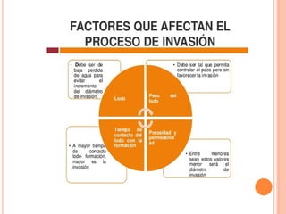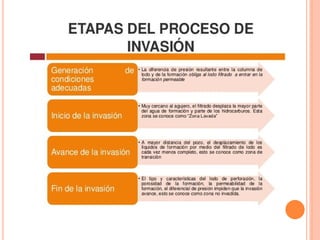 El documento habla sobre el proceso de invasión durante la perforación de pozos petroleros. La invasión ocurre cuando el lodo de perforación y sus fluidos se filtran e ingresan a la formación geológica, desplazando los fluidos originales y creando una zona invadida adyacente al pozo. Esto altera las lecturas de resistividad, por lo que se usan tres curvas de resistividad para medir zonas someras, medias y profundas.