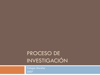 El documento describe las etapas del proceso de investigación, incluyendo la determinación de objetivos, hipótesis y problema; la selección de unidades de estudio y muestra; el desarrollo de métodos y técnicas de recopilación de información; la aplicación de instrumentos; la organización y procesamiento de datos; el análisis e interpretación; y la generación de un informe con conclusiones y recomendaciones.