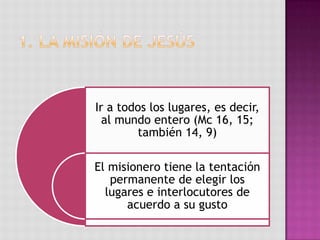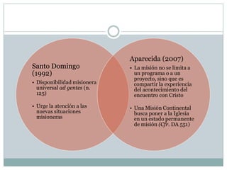 El documento describe el proceso de la misión permanente de la Iglesia en Latinoamérica y la diócesis a través del quinto plan diocesano de pastoral. Se enfatiza que la misión de la Iglesia es evangelizar siguiendo el ejemplo de Jesús y los pobres, y requiere testigos auténticos guiados por el Espíritu Santo. El plan diocesano actual promueve una Iglesia misionera que ofrezca vida a través de la Palabra, la Liturgia y la Caridad.