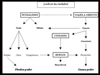 Las cruzadas contribuyeron a la crisis del feudalismo y al resurgimiento urbano en Europa. La participación de los señores feudales en las cruzadas debilitó el sistema feudal, mientras que el crecimiento demográfico y los avances agrícolas impulsaron el desarrollo de las ciudades. Las nuevas ciudades se organizaron en torno al comercio, las guildas y los gremios, marcando el surgimiento de la burguesía y dando origen al capitalismo mercantil en Europa.