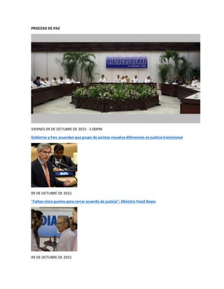 El documento resume las discusiones sobre el proceso de paz entre el gobierno colombiano y las FARC. Camilo Martínez, director de un centro de pensamiento, opina que las FARC deben someterse a la justicia por sus crímenes, mientras que Luisa Uribe apoya un modelo de reinserción inclusivo. Algunos dudan que el proceso conducirá a una paz duradera debido a la complicidad del gobierno y la continuidad de la guerrilla.