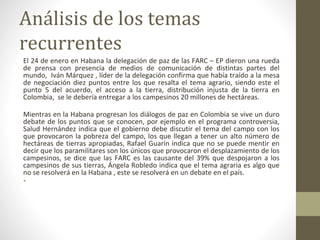 El documento resume los debates en Colombia sobre los acuerdos de paz entre el gobierno y las FARC. Se discuten temas como la reforma agraria, las drogas ilícitas, y el enfoque de género. Varios líderes políticos expresan sus opiniones sobre los acuerdos y el plebiscito para ratificarlos, incluyendo al presidente Santos, Humberto de la Calle, y Álvaro Uribe.