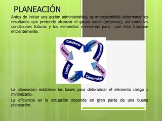 Este documento presenta conceptos clave sobre planeación administrativa. Define planeación como el proceso de determinar objetivos y cursos de acción para lograrlos mediante investigación y desarrollo de planes detallados. Explica que la planeación incluye etapas como establecer la misión, objetivos, estrategias, políticas, programas y presupuestos. Finalmente, destaca que la toma de decisiones es un paso fundamental de la planeación al seleccionar la mejor alternativa entre opciones disponibles.