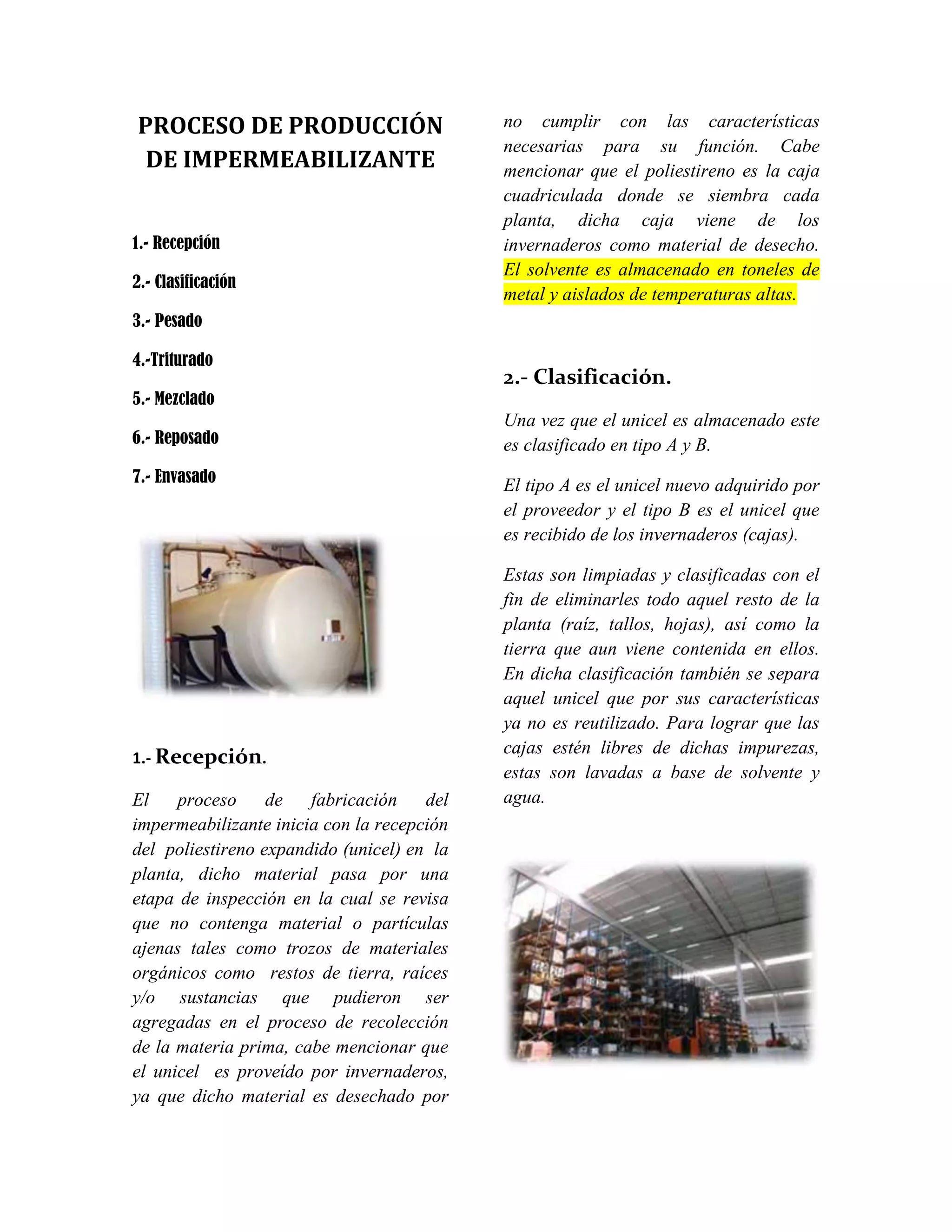 El proceso de producción de impermeabilizante comienza con la recepción del poliestireno expandido (unicel) proveniente de invernaderos. Luego, el unicel es clasificado, pesado y triturado para reducir su tamaño. Después, el unicel triturado se mezcla con solvente durante 3 horas para desintegrarse completamente. La mezcla resultante se reposa durante 2-3 días para lograr total transparencia. Finalmente, el impermeabilizante terminado se envasa en botes de 20 litros y se almacena para distribuc