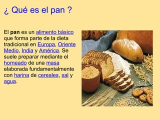 El pan se elabora a partir de ingredientes básicos como harina, sal y agua. El proceso consta de tres fases: 1) agregar los ingredientes que incluyen levadura, agua, azúcar y manteca; 2) mezclar y amasar la masa durante 10 minutos hasta que quede homogénea y elástica; 3) formar bollos con la masa, dejarlos leudar 45 minutos y hornearlos a 200°C durante 20 minutos hasta que doren.