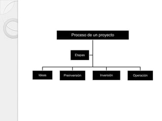 Este documento resume las diferentes etapas de un proyecto, incluyendo la generación de ideas, preinversión, inversión, operación y evaluación. También describe los estudios técnico, de mercado, organizacional-administrativo-legal, financiero e impacto ambiental que son necesarios para analizar un proyecto de manera completa.