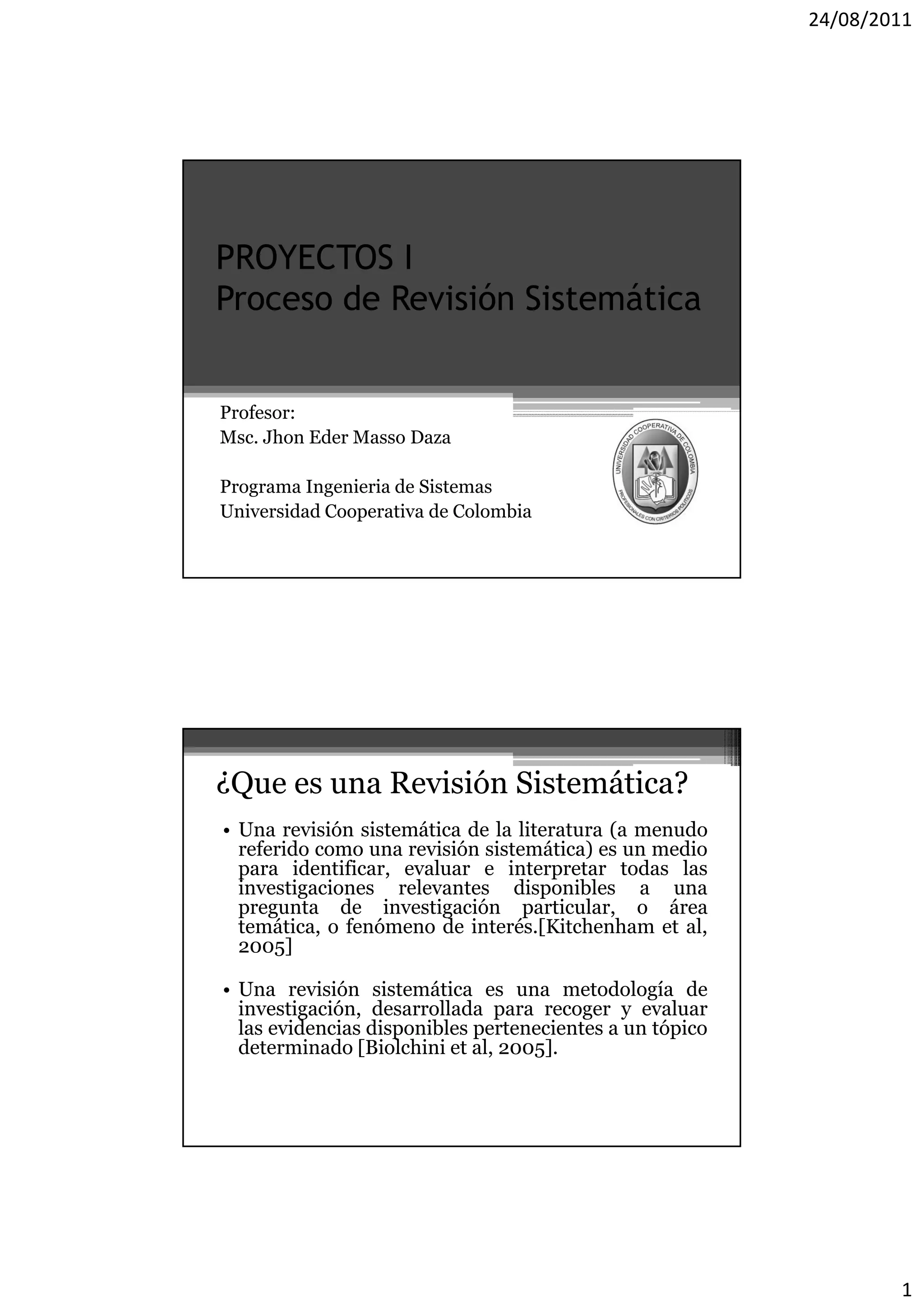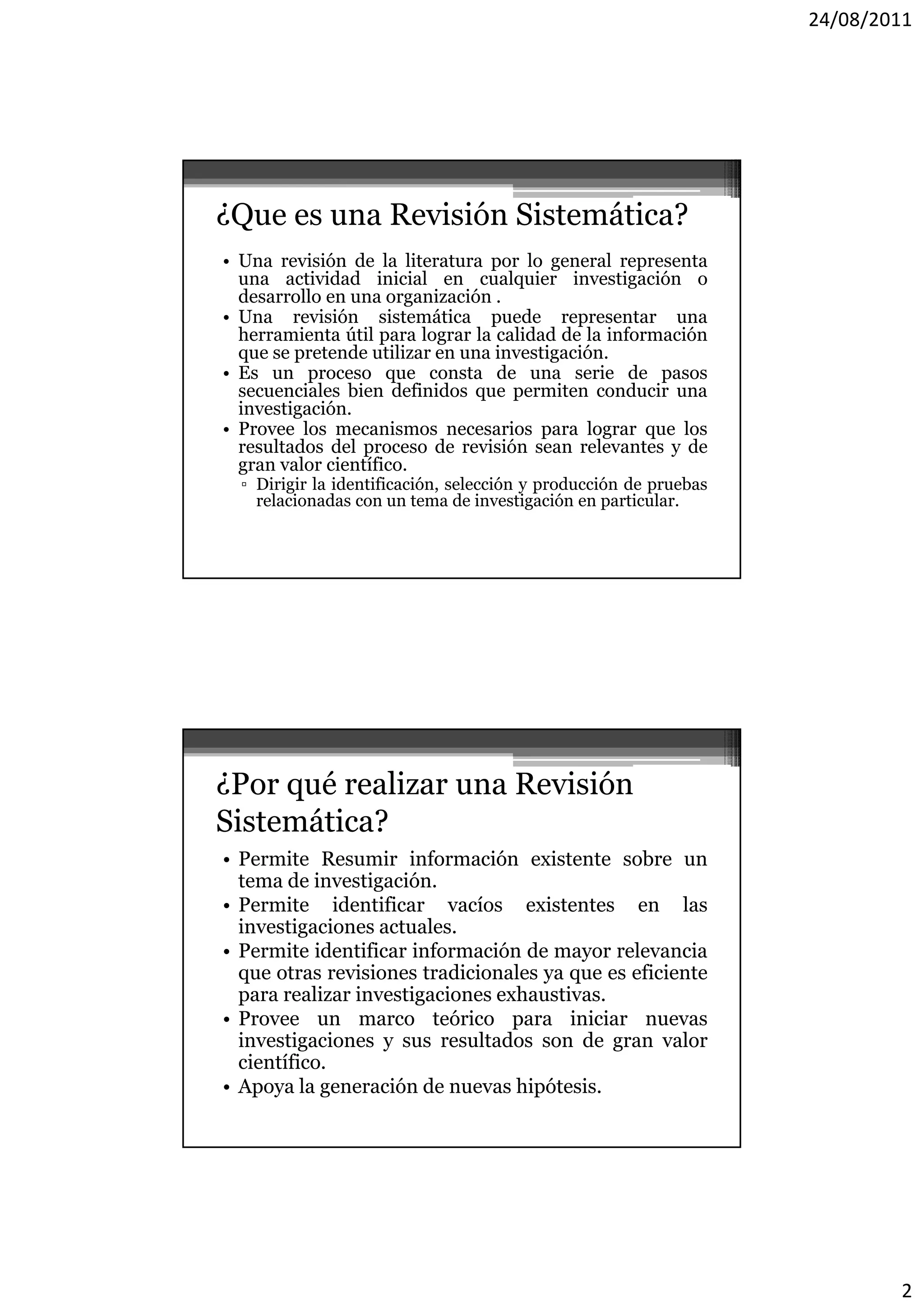 Este documento describe el proceso de revisión sistemática para investigaciones. Explica que una revisión sistemática identifica y evalúa toda la investigación relevante sobre una pregunta mediante un proceso bien definido. El proceso incluye la planificación, ejecución y reporte de la revisión, con pasos como formular preguntas de investigación, seleccionar fuentes, evaluar estudios y analizar resultados.