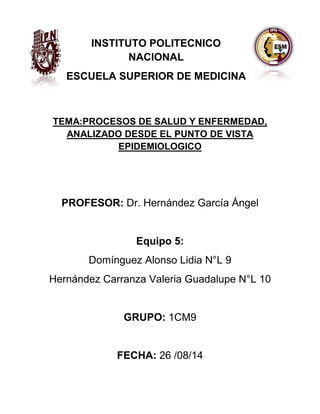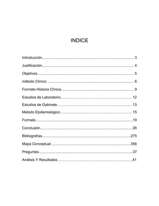 Este documento presenta los métodos clínicos y epidemiológicos utilizados para estudiar procesos de salud y enfermedad a nivel individual y poblacional. Describe los formatos para la historia clínica individual y el estudio de comunidad, incluyendo secciones sobre antecedentes, exploración física y estudios de laboratorio. Finalmente, analiza los datos obtenidos en el estudio de comunidad y los recopila en un informe final.