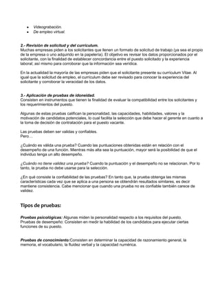 El proceso de selección consiste en determinar el mejor candidato para un puesto mediante una serie de pasos que incluyen entrevistas preliminares, revisión de solicitudes y currículums, pruebas de idoneidad, entrevistas formales, verificación de referencias y exámenes médicos, culminando con la decisión final de contratación. El objetivo es identificar a los candidatos más calificados de acuerdo con los requisitos del puesto y la organización.