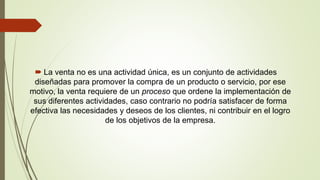 1) El documento describe el proceso de ventas y sus diferentes etapas, incluyendo la identificación de necesidades del cliente, búsqueda de información, evaluación de alternativas y decisión de compra.