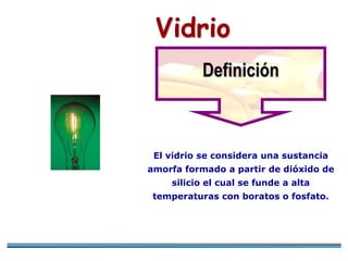 El proceso de fabricación de vidrio involucra las siguientes etapas: 1) Trituración y mezclado de la materia prima que incluye silice y fundentes; 2) Fusión de la mezcla a altas temperaturas; 3) Conformado del vidrio fundido a través de métodos como soplado, estirado o prensado; 4) Enfriamiento y corte del vidrio; y 5) Embalaje y almacenamiento del producto terminado.