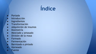 El documento describe las etapas del proceso de elaboración del pan, incluyendo la adquisición de ingredientes como la harina y el agua, mezclado y amasado de la masa, división en piezas individuales, formado, fermentación, barnizado o pintado, y horneado para cocinar el pan.