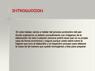 Este documento describe el proceso de producción del pan. Explica los ingredientes necesarios como harina, levadura, sal y agua tibia. Luego detalla los pasos del proceso que incluyen mezclar los ingredientes para formar una masa elástica, dejarla reposar para que duplique su volumen, darle forma, hornearlo y finalmente degustarlo. El proceso productivo del pan se realiza de forma casera y económica siguiendo estos pasos.