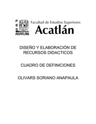 El documento define varios términos relacionados con los recursos didácticos y el proceso de enseñanza y aprendizaje. Define el proceso didáctico, material educativo, objeto de aprendizaje y medio didáctico. En general, estos términos se refieren a cualquier recurso, herramienta o material que se utiliza para facilitar la enseñanza por parte del profesor y el aprendizaje por parte del estudiante de una manera significativa.