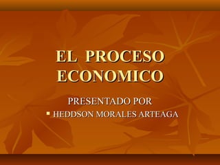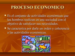El proceso económico es el conjunto de actividades que las personas realizan en una sociedad para satisfacer sus necesidades. Se caracteriza por dar orden a las actividades de producción, circulación, distribución, consumo e inversión. Estas fases involucran la combinación de recursos como la tierra, capital, trabajo y tecnología para crear bienes y servicios, los cuales circulan entre productores y consumidores y retribuyen a cada factor de producción.