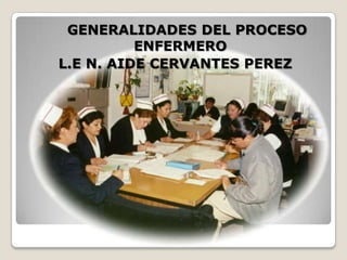 Este documento proporciona una introducción general al proceso de enfermería. Explica que la enfermería es un arte y ciencia que brinda cuidados al individuo, familia y comunidad. Define el proceso de enfermería como un método sistemático para proporcionar cuidados humanistas centrados en lograr objetivos. Describe las etapas del proceso de enfermería que incluyen valoración, diagnóstico, planeación, ejecución y evaluación.