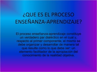 El proceso de enseñanza-aprendizaje es un diálogo entre el maestro y el estudiante. La enseñanza debe facilitar la apropiación del conocimiento de una manera que promueva el desarrollo futuro del estudiante. El aprendizaje es un proceso complejo de adquirir nuevos conocimientos o habilidades que pueden aplicarse en el futuro. Tanto la enseñanza como el aprendizaje son procesos interdependientes que educan al individuo y la sociedad.