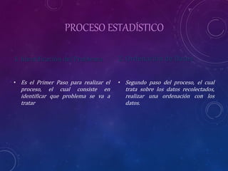 El documento proporciona una explicación del proceso estadístico, incluyendo los pasos de identificación del problema, ordenación y tabulación de datos. Describe las columnas utilizadas en una tabla de valores para organizar los datos recolectados, como intervalo, frecuencia absoluta y desviación. Finalmente, presenta un ejemplo de tabla de valores y gráfica de sectores para un conjunto de datos de calificaciones.