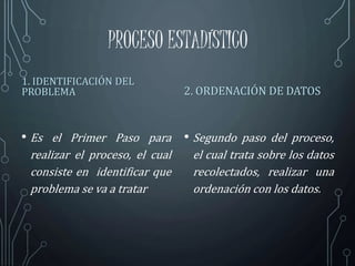 Este documento describe el proceso estadístico para analizar datos recolectados. Incluye los pasos de identificación del problema, ordenación de datos y tabulación de datos. Explica cómo construir una tabla de valores con columnas para intervalo, marca de clase, frecuencia absoluta, y otros valores necesarios para realizar cálculos estadísticos como desviación y desviación al cuadrado. También incluye una gráfica de sectores que resume las frecuencias relativas de calificaciones de una unidad.