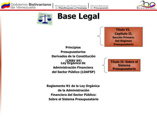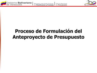 El documento describe el proceso de formulación del anteproyecto de presupuesto en Venezuela. Explica que el presupuesto público es el instrumento para implementar las directrices gubernamentales y de planificación, asignar recursos financieros a las instituciones públicas a través de proyectos de acuerdo con las políticas nacionales. Detalla las etapas que incluyen la generación de directrices por parte del Ministerio de Planificación, la elaboración de fichas de proyectos, la consolidación del anteproyecto por parte del Ministerio de Finanzas y la a