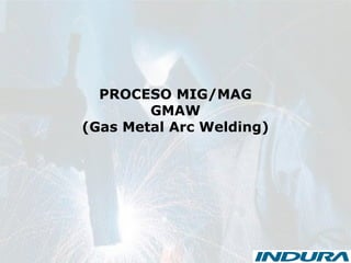 El documento describe el proceso de soldadura MIG/MAG (Gas Metal Arc Welding). Explica que este proceso utiliza un alambre continuo y una protección gaseosa, y que el gas puede ser inerte o activo dependiendo del proceso MIG o MAG. También describe los diferentes tipos de transferencia de metal, incluyendo cortocircuito, globular y spray, así como las ventajas y desventajas de cada uno.