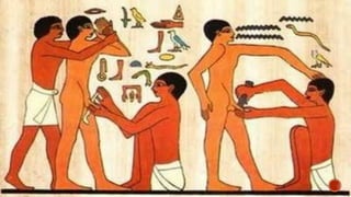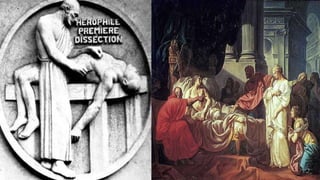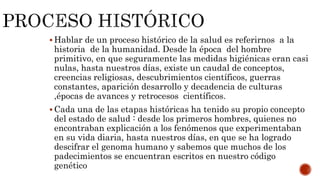 El documento describe la historia de la salud y la medicina a través de las distintas épocas. Desde los primeros hombres que no entendían las enfermedades hasta el descubrimiento del genoma humano. Cubre avances de distintas culturas como los egipcios, mexicas y griegos. Explica contribuciones de Hipócrates, la escuela de Alejandría y médicos romanos. También habla sobre el desarrollo de hospitales en la medicina árabe y las contribuciones de científicos a lo largo de la histor