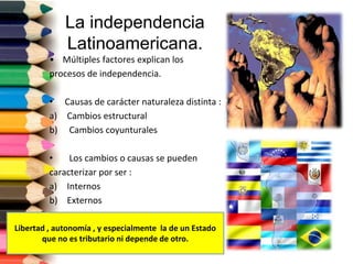 Los principales factores que llevaron a la independencia de América incluyen las ideas de la Ilustración que se difundieron desde Europa, la Revolución Francesa y la invasión de España por Napoleón, lo que provocó que se formaran juntas de gobierno en ciudades como Caracas y Buenos Aires. Las luchas entre patriotas y realistas culminaron en batallas como Rancagua y Chacabuco, estableciendo la independencia de Chile.