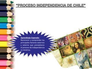 El documento resume los principales factores que llevaron a la independencia de América Latina. Múltiples causas, tanto internas como externas, contribuyeron al proceso. Entre las causas externas se encuentran las ideas de la Ilustración y revoluciones como la independencia de EE.UU. y la Revolución Francesa. Las causas internas incluyen el descontento criollo y la saturación de los mercados locales. Estos factores llevaron a la formación de juntas de gobierno y la lucha por la independencia en la primera et