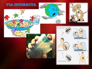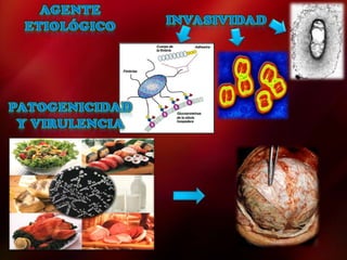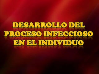 El documento describe el proceso de infección, que implica la colonización y/o invasión de un huésped por organismos patógenos, potencialmente causando enfermedad. El agente etiológico puede transmitirse de un reservorio al huésped de forma directa o indirecta, y el huésped cuenta con defensas externas e internas contra la infección.