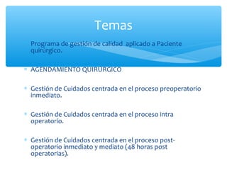 Este documento describe los protocolos y procedimientos para garantizar la seguridad del paciente quirúrgico. Incluye información sobre la programación quirúrgica, el proceso preoperatorio, intraoperatorio y postoperatorio. Se enfatiza la importancia del consentimiento informado, la pausa quirúrgica segura, el manejo de muestras, y el monitoreo del paciente durante la recuperación. El objetivo general es maximizar la seguridad y bienestar del paciente a través de todos los pasos del proceso quirúrgico.