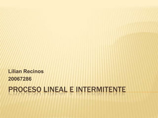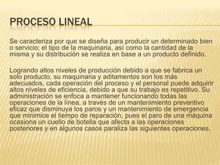Este documento describe los procesos lineales e intermitentes. Los procesos lineales se caracterizan por producir un solo producto de manera eficiente usando maquinaria especializada. Los procesos intermitentes producen varios productos por lotes requiriendo mayor planificación y control debido a su menor eficiencia.