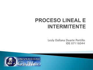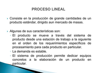 El documento describe dos tipos de procesos de producción: procesos lineales y procesos intermitentes. Los procesos lineales se caracterizan por ser continuos, automatizados, eficientes y producir grandes volúmenes a bajo costo. Los procesos intermitentes permiten una amplia gama de productos de forma flexible pero a menor velocidad y mayor costo debido a la producción en lotes pequeños y cambios frecuentes en los productos.