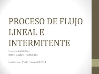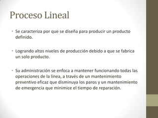 Este documento describe y compara los procesos de producción lineal e intermitente. El proceso lineal se caracteriza por producir un solo producto de forma continua logrando altos niveles de producción, mientras que el proceso intermitente produce lotes de varios productos de forma discontinua a intervalos. Algunos ejemplos son la fabricación de papel como proceso lineal y la línea de ensamble de automóviles como proceso intermitente.