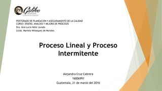 Este documento describe dos tipos de procesos: procesos lineales y procesos intermitentes. Los procesos lineales se caracterizan por una producción secuencial y continua de bienes o servicios, como la producción de papel o vino. Los procesos intermitentes involucran la producción por lotes a intervalos, con una variedad más alta de productos y bajo pedido, como la elaboración de anillos de compromiso o servicios de taller mecánico. Se comparan ambos procesos en términos de volumen, flexibilidad, efici
