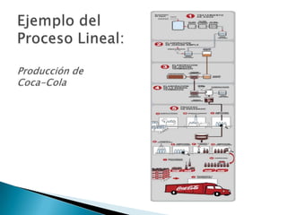 Este documento presenta una comparación entre los procesos lineales e intermitentes. Los procesos lineales tienen un flujo regular y continuo de producción, son eficientes para altos volúmenes con baja variedad. Los procesos intermitentes tienen un flujo irregular sin secuencia fija, son flexibles para satisfacer requerimientos de clientes pero requieren más planificación y control.