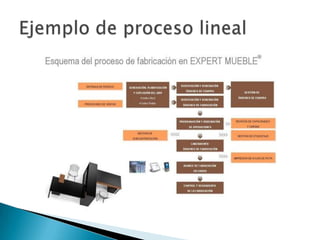 El documento describe dos tipos de procesos de producción: procesos lineales y procesos intermitentes. Los procesos lineales se enfocan en la producción continua de un solo producto usando máquinas especializadas, lo que resulta en altos niveles de producción y eficiencia. Los procesos intermitentes involucran la producción por lotes de una variedad de productos usando centros de trabajo multifuncionales, requiriendo una cuidadosa planificación y personal altamente calificado.