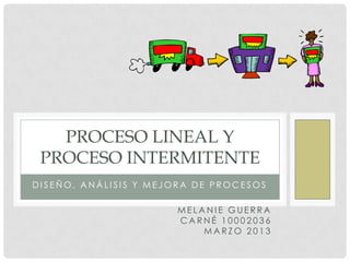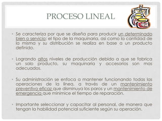 El documento compara y contrasta los procesos lineales e intermitentes. El proceso lineal se caracteriza por producir un solo producto de manera eficiente, mientras que el proceso intermitente produce varios productos en lotes con menos eficiencia pero más flexibilidad. El proceso lineal requiere personal menos calificado y mantenimiento preventivo, mientras que el proceso intermitente necesita más planificación, control y personal con mayor destreza.