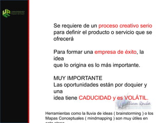 El documento describe el proceso de desarrollo de una idea de negocio, incluyendo la generación de ideas a través de técnicas como lluvia de ideas y mapas conceptuales, la evaluación de las ideas según su nivel de innovación, mercado potencial y otros criterios, y la selección de un nombre atractivo, descriptivo y original para la empresa.