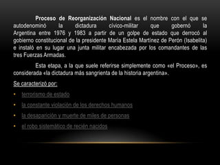 El documento describe el Proceso de Reorganización Nacional, la dictadura militar que gobernó Argentina entre 1976-1983. Se caracterizó por el terrorismo de estado, violaciones a los derechos humanos y desaparición de miles de personas. La junta militar implementó un plan económico neoliberal y censuró la cultura para imponer orden a través de la disciplina autoritaria.