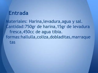 Este documento describe el proceso productivo del pan, incluyendo los materiales necesarios (harina, levadura, agua y sal), las cantidades (750g de harina, 15g de levadura fresca, 450cc de agua tibia) y algunas formas de pan como hallulla, coliza y dobladitas. Explica los pasos de tamizar la harina y sal, mezclar la levadura con agua tibia, y luego hacer un hueco en la harina para verter la mezcla de levadura y remover hasta que la masa se desprenda de los bor