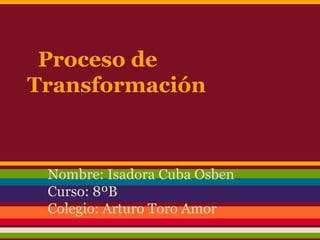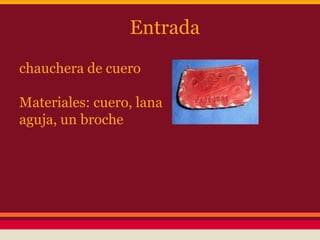 El documento describe el proceso de transformación de una chauchera de cuero en un monedero. Se detallan 4 pasos: 1) Hacer el molde del monedero y agregar un semicírculo, 2) Cortar el cuero y unirlo con el semicírculo, 3) Perforar el cuero y coserlo con lana, 4) Colocar un broche para completar el monedero.