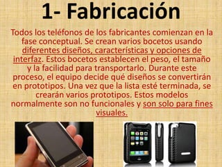El proceso productivo de un teléfono celular comienza con la fase conceptual donde se crean diseños y prototipos. Luego, en la fase de construcción, se seleccionan los componentes electrónicos y de software y se ensamblan las diferentes partes del teléfono. Finalmente, el teléfono pasa por pruebas para verificar su funcionamiento antes de ser embalado y distribuido a puntos de venta para su comercialización.