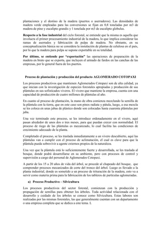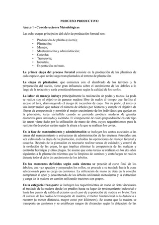 El documento describe las principales etapas del proceso productivo forestal, incluyendo la producción de plantas en viveros, plantación, manejo, mantenimiento, cosecha, transporte, industria y exportación. Se detalla que la primera etapa es la producción de plantines en viveros, seguida por la preparación del terreno y plantación. Posteriormente, se realizan tareas de manejo como podas y raleos, y mantenimiento hasta la cosecha de los árboles y su transporte a ser procesados o exportados.