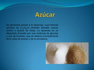El documento describe el proceso de producción de azúcar a partir de la caña de azúcar. La caña crece en climas cálidos y húmedos y contiene sacarosa en sus tallos. El proceso incluye la cosecha de la caña, su molienda para extraer el jugo, la evaporación del jugo para concentrar la sacarosa, la cristalización de la sacarosa y el refinado y empacado del azúcar final. El azúcar se almacena y comercializa de acuerdo con las normas establecidas.