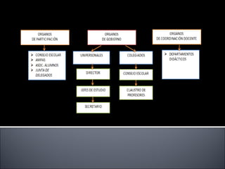 El documento describe los roles y responsabilidades de los directores de centros educativos públicos. Estos incluyen dirigir y coordinar todas las actividades del centro, ejercer la dirección pedagógica, garantizar el cumplimiento de las leyes, ejercer la jefatura del personal, favorecer la convivencia, impulsar la colaboración con las familias y la evaluación, y convocar actos académicos. La selección del director se realiza mediante un concurso de méritos entre profesores que evalúa sus méritos y el pro