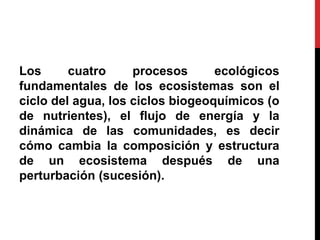 Los cuatro procesos ecológicos fundamentales son el ciclo del agua, los ciclos biogeoquímicos, el flujo de energía y la dinámica de las comunidades. El ciclo del agua involucra la evaporación, transporte y precipitación del agua. Los ciclos biogeoquímicos describen cómo los nutrientes se mueven entre organismos y el ambiente. El flujo de energía comienza con la fotosíntesis de las plantas y pasa a través de las cadenas alimentarias. La diná