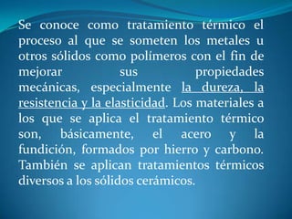 El documento describe los diferentes tipos de tratamientos térmicos aplicados a los metales y aleaciones para mejorar sus propiedades mecánicas. Estos tratamientos incluyen el recocido, la formación de martensita, el endurecimiento por precipitación y el endurecimiento superficial. Explica los procesos involucrados en cada uno de estos tratamientos térmicos.